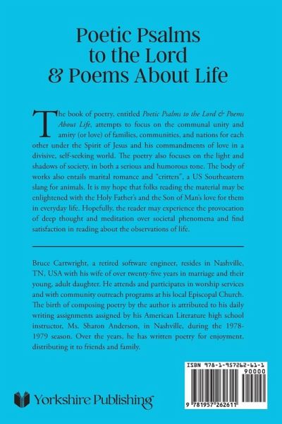 Bruce Cartwright, a retired software engineer, resides in Nashville, TN, USA with his wife of over twenty-five years in marriage, and theiryoung, adult daughter. He attends and participates in worship services and with community outreach programs at his local Episcopal Church. The birth of composing poetry by the author is attributed to his daily writing assignments assigned by his American Literature high school instructor, Ms. Sharon Anderson, in Nashville, during the 1978-1979 season. Over the years, he has written poetry for enjoyment, distributing it to friends and family.