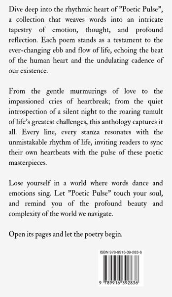 Dive deep into the rhythmic heart of "Poetic Pulse", a collection that weaves words into an intricate tapestry of emotion, thought, and profound reflection. Each poem stands as a testament to the ever-changing ebb and flow of life, echoing the beat of the human heart and the undulating cadence of our existence.From the gentle murmurings of love to the impassioned cries of heartbreak; from the quiet introspection of a silent night to the roaring tumult of life's greatest challenges, this anthology captures it all. Every line, every stanza resonates with the unmistakable rhythm of life, inviting readers to sync their own heartbeats with the pulse of these poetic masterpieces.Lose yourself in a world where words dance and emotions sing. Let "Poetic Pulse" touch your soul, and remind you of the profound beauty and complexity of the world we navigate.Open its pages and let the poetry begin. Copyright (c) 2023 Swan Charm Publishing