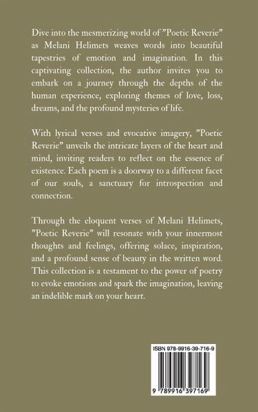 Dive into the mesmerizing world of "Poetic Reverie" as Melani Helimets weaves words into beautiful tapestries of emotion and imagination. In this captivating collection, the author invites you to embark on a journey through the depths of the human experience, exploring themes of love, loss, dreams, and the profound mysteries of life. With lyrical verses and evocative imagery, "Poetic Reverie" unveils the intricate layers of the heart and mind, inviting readers to reflect on the essence of existence. Each poem is a doorway to a different facet of our souls, a sanctuary for introspection and connection. Through the eloquent verses of Melani Helimets, "Poetic Reverie" will resonate with your innermost thoughts and feelings, offering solace, inspiration, and a profound sense of beauty in the written word. This collection is a testament to the power of poetry to evoke emotions and spark the imagination, leaving an indelible mark on your heart. Copyright © 2024 Book Fairy Publishing