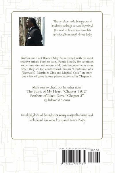 Author and Poet Bruce Daley has returned with his most creative artistic book to date...Poetic Scrolls. He continues to be inventive and resourceful, finishing statements even when they are too controversial. Poems "Confession of a Werewolf, Martin & Gina and Magical Cave" are only but a few great feature pieces expressed in Chapter 4. Make sure to check out his other titles: The Spirit of My Heart "Chapter 1 & 2" Feathers of Black Dove "Chapter 3" @ bdove316.com