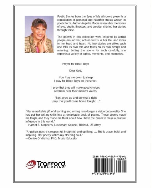 Poetic Stories from the Eyes of My Windows presents a compilation of personal and heartfelt stories written in poetic form. Author Angellia Moore reveals her memories of love, death, illnesses, and suicide, sharing her stories through verse. The poems in this collection were inspired by actual people around her, actual events in her life, and ideas in her head and heart. No two stories are alike; each one tells its own tale and takes on its own design and meaning. Setting the scene for each carefully, she explores a variety of topics, moments, and memories. Prayer for Black Boys Dear God, Now I lay me down to sleep I pray for Black Boys on the street. I pray that they will make good choices Let them hear their mama's voices. "Son, grow up and do what's right I pray that you'll come home tonight ..." "Her remarkable gift of dreaming and writing is no longer a vision but a reality. She has put her writing skills into a remarkable book of poems. These poems made me laugh, and they made me think about how I have the power to make a positive influence in this world." -Harriet S. Stephens, Lieutenant Colonel, Retired, US Army "Angellia's poetry is respectful, insightful, and uplifting. ... She is brave, bold, and inspiring. Her poetry wakes my sleeping soul." -Denise Ondishko, PhD, Music Educator