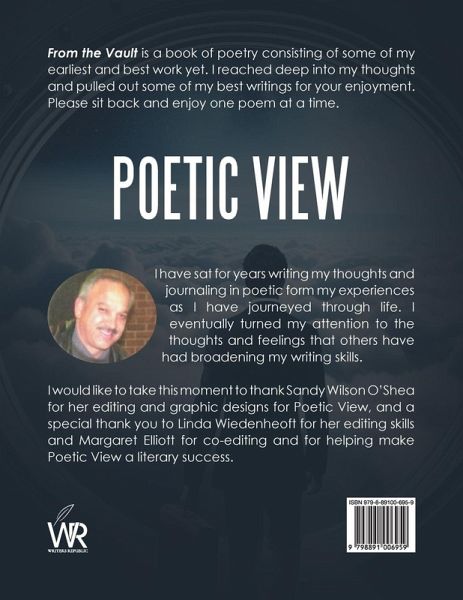 I have sat for years writing my thoughts and journaling in poetic form my experiences as I have journeyed through life. I eventually turned my attention to the thoughts and feelings that others have had broadening my writing skills.I would like to take this moment to thank Sandy Wilson O'Shea for her editing and graphic designs for Poetic View, and a special thank you to Linda Wiedenheoft for her editing skills and Margaret Elliott for co-editing and for helping make Poetic View a literary success.