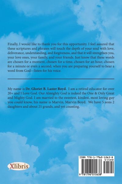 Finally, I would like to thank you for this opportunity. I feel assured that these scriptures and phrases will touch the depth of your soul with love, deliverance, understanding, and forgiveness, and that it will strengthen you, your love ones, your family, and your friends. Just know that these words are chosen for a moment, chosen for a time, chosen for an hour, chosen for a minute or even a second, when you are preparing yourself to hear a word from God-listen for his voice.