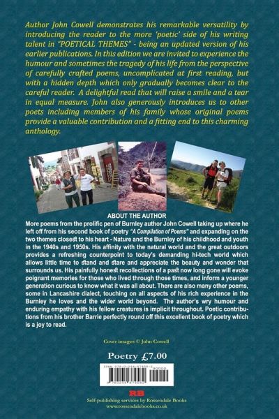 More poems from the prolific pen of Burnley author John Cowell taking up where he left off from his second book of poetry "A Compilation of Poems" and expanding on the two themes closest to his heart - Nature and the Burnley of his childhood and youth in the 1940s and 1950s. His affinity with the natural world and the great outdoors provides a refreshing counterpoint to today's demanding hi-tech world which allows little time to stand and stare and appreciate the beauty and wonder that surrounds us. His painfully honest recollections of a past now long gone will evoke poignant memories for those who lived through those times, and inform a younger generation curious to know what it was all about. There are also many other poems, some in Lancashire dialect, touching on all aspects of his rich experience in the Burnley he loves and the wider world beyond. The author's wry humour and enduring empathy with his fellow creatures is implicit throughout.