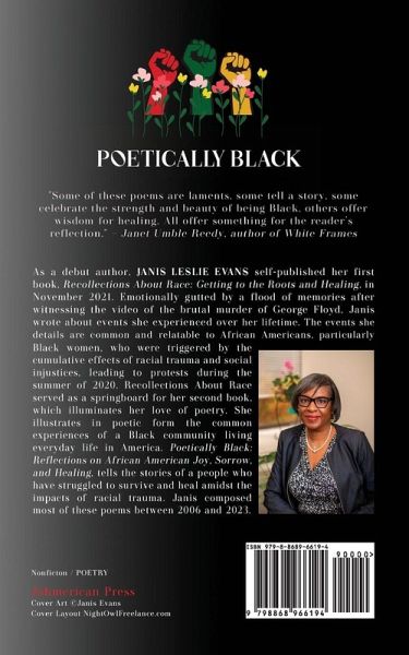 Janis Leslie Evans is a graduate of Howard University where she earned a master's degree in counseling psychology from the School of Education. She received her bachelor's degree in psychology from Buffalo State University in her hometown of Buffalo, New York. As a licensed professional counselor and founder of Evans Counseling & Consultation, PLLC, her career spans over 30 years in mental health. As a debut author, Janis wrote her first book, Recollections About Race: Getting to the Roots and Healing, self-published in November 2021. Emotionally gutted by a flood of memories after witnessing the video of the brutal murder of George Floyd, Janis wrote about events she experienced over her lifetime. The events she details are common and relatable to African Americans, particularly Black women, who were triggered by the cumulative effects of witnessing the racial upheaval and protests of the summer of 2020. Recollections About Race served as a springboard for her second book, which illuminates her love of poetry. She illustrates in poetic form the common experiences of a Black community living everyday life in America. Poetically Black: Reflections on African American Joy, Sorrow, and Healing, tells the stories of a people who have struggled to survive and heal amidst the impacts of racial trauma. Janis composed most of these poems between 2006 and 2023.