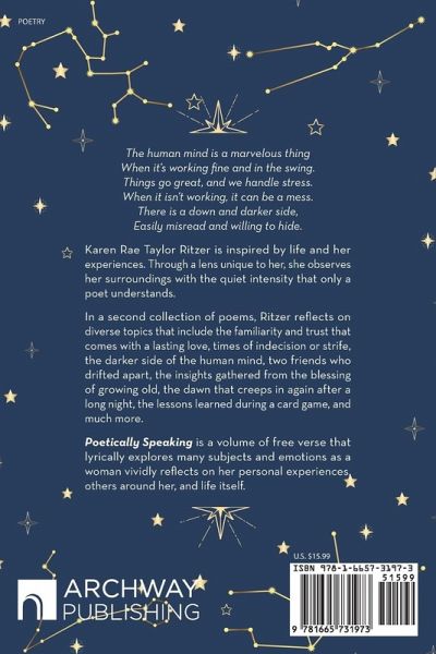 Karen Rae Taylor Ritzer is inspired by life and her experiences. Through a lens unique to her, she observes her surroundings with the quiet intensity that only a poet understands. In a second collection of poems, Ritzer reflects on diverse topics that include the familiarity and trust that comes with a lasting love, times of indecision or strife, the darker side of the human mind, two friends who drifted apart, the insights gathered from the blessing of growing old, the dawn that creeps in again after a long night, the lessons learned during a card game, and much more. Poetically Speaking is a volume of free verse that lyrically explores many subjects and emotions as a woman vividly reflects on her personal experiences, others around her, and life itself.