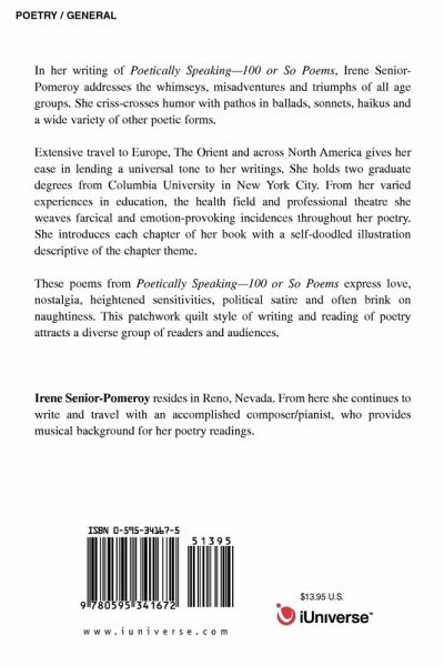 In her writing of Poetically Speaking--100 or So Poems, Irene Senior-Pomeroy addresses the whimseys, misadventures and triumphs of all age groups. She criss-crosses humor with pathos in ballads, sonnets, haikus and a wide variety of other poetic forms. Extensive travel to Europe, The Orient and across North America gives her ease in lending a universal tone to her writings. She holds two graduate degrees from Columbia University in New York City. From her varied experiences in education, the health field and professional theatre she weaves farcical and emotion-provoking incidences throughout her poetry. She introduces each chapter of her book with a self-doodled illustration descriptive of the chapter theme. These poems from Poetically Speaking--100 or So Poems express love, nostalgia, heightened sensitivities, political satire and often brink on naughtiness. This patchwork quilt style of writing and reading of poetry attracts a diverse group of readers and audiences.