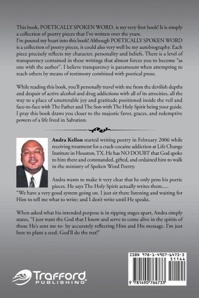 This book, POETICALLY SPOKEN WORD, is my very first book! It is simply a collection of poetry pieces that I've written over the years. I've poured my heart into this book! Although POETICALLY SPOKEN WORD is a collection of poetry pieces, it could also very well be my autobiography. Each piece precisely reflects my character, personality and beliefs. There is a level of transparency contained in these writings that almost forces you to become "as one with the author". I believe transparency is paramount when attempting to reach others by means of testimony combined with poetical prose. While reading this book, you'll personally travel with me from the devilish depths and despair of active alcohol and drug addictions with all of its atrocities, all the way to a place of unutterable joy and gratitude positioned inside the veil and face-to-face with The Father and The Son with The Holy Spirit being your guide. I pray this book draws you closer to the majestic favor, graces, and redemptive powers of a life lived in Salvation.