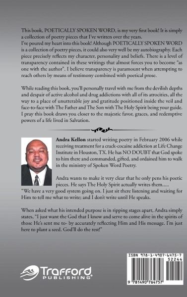 This book, POETICALLY SPOKEN WORD, is my very first book! It is simply a collection of poetry pieces that I've written over the years. I've poured my heart into this book! Although POETICALLY SPOKEN WORD is a collection of poetry pieces, it could also very well be my autobiography. Each piece precisely reflects my character, personality and beliefs. There is a level of transparency contained in these writings that almost forces you to become "as one with the author". I believe transparency is paramount when attempting to reach others by means of testimony combined with poetical prose. While reading this book, you'll personally travel with me from the devilish depths and despair of active alcohol and drug addictions with all of its atrocities, all the way to a place of unutterable joy and gratitude positioned inside the veil and face-to-face with The Father and The Son with The Holy Spirit being your guide. I pray this book draws you closer to the majestic favor, graces, and redemptive powers of a life lived in Salvation.