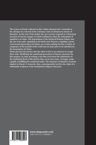 The essays on Dante collected in this volume interpret his Commedia as the attempt of a renewal of the Christian work of salvation by means of literature. In the view of his author, the sacro poema responds to a historical moment of extreme danger, in which nothing less than the redemption of mankind is at stake. The degradation of the medieval Roman Empire and the rise of an early capitalism in his birth town Florence, entailing a pernicious moral depravation for Dante, are to him nothing else but a variety of symptoms of the backfall of the world into its state prior to its salvation by the incarnation of Christ.