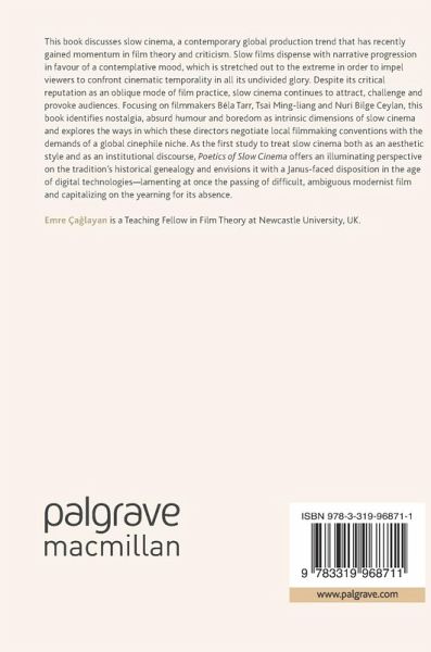 This book discusses slow cinema, a contemporary global production trend that has recently gained momentum in film theory and criticism. Slow films dispense with narrative progression in favour of a contemplative mood, which is stretched out to the extreme in order to impel viewers to confront cinematic temporality in all its undivided glory. Despite its critical reputation as an oblique mode of film practice, slow cinema continues to attract, challenge and provoke audiences. Focusing on filmmakers Béla Tarr, Tsai Ming-liang and Nuri Bilge Ceylan, this book identifies nostalgia, absurd humour and boredom as intrinsic dimensions of slow cinema and explores the ways in which these directors negotiate local filmmaking conventions with the demands of a global cinephile niche. As the first study to treat slow cinema both as an aesthetic style and as an institutional discourse, Poetics of Slow Cinema offers an illuminating perspective on the tradition's historical genealogy and envisions it with a Janus-faced disposition in the age of digital technologies-lamenting at once the passing of difficult, ambiguous modernist film and capitalizing on the yearning for its absence.