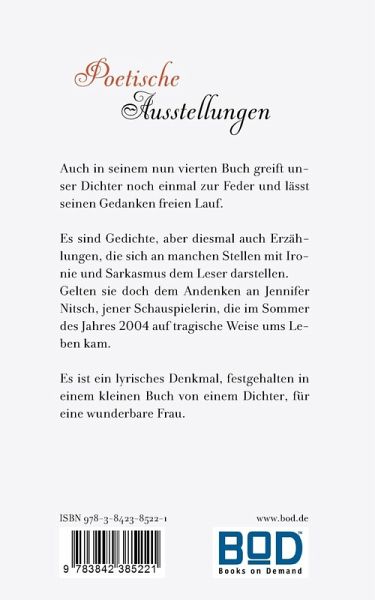 Auch in seinem nun vierten Buch greift unser Dichter noch einmal zur Feder und lässt seinen Gedanken freien Lauf.Es sind Gedichte, aber diesmal auch Erzählungen, die sich an manchen Stellen mit Ironie und Sarkasmus dem Leser darstellen. Gelten sie doch dem Andenken an Jennifer Nitsch, jener Schauspielerin, die im Sommer des Jahres 2004 auf tragische Weise ums Leben kam.Es ist ein lyrisches Denkmal, festgehalten in einem kleinen Buch von einem Dichter, für eine wunderbare Frau.