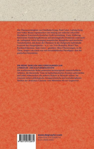 Die Übersetzertätigkeit von Friedhelm Kemp, Paul Celan, Ludwig Harig und Volker Braun repräsentiert eine bislang nur teilweise erforschte Hochphase französisch-deutscher Lyrikvermittlung. Unter Einbezug historischer Entstehungskontexte und poetologischer Prämissen untersucht die vorliegende Arbeit Strategien semantischer, klanglicher und metrischer Transformation, mit denen die Übersetzer in der Zielsprache individuelle Lesarten der Ausgangstexte - u. a. von Yves Bonnefoy, René Char, Raymond Queneau, Alain Lance - gestalten. Diese Übersetzungen, so die These, zeugen von einem sich neu herausbildenden Paradigma: dem der poetischen Interaktion.