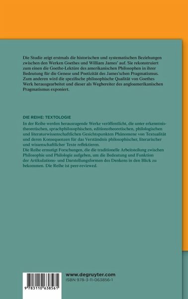 Die Studie stellt eine Pionierarbeit dar: Sie zeigt erstmals die historischen und systematischen Beziehungen zwischen den Werken Goethes und William James' auf. Dabei wird zum einen die Goethe-Lektüre des US-amerikanischen Philosophen in ihrer Bedeutung für die Genese und Poetizität des James'schen Pragmatismus rekonstruiert. Zum anderen wird die (proto-)pragmatische Dimension von Goethes Werk herausgearbeitet und dieser als literarischer Philosoph und Wegbereiter des angloamerikanischen Pragmatismus exponiert. Mit der Konturierung der vielfältigen diskursiven Relationen zwischen literarischen, philosophischen und naturwissenschaftlichen Wissensordnungen der Goethezeit und jenen der US-amerikanischen Kultur des späten 19. und beginnenden 20. Jahrhunderts gewinnt der Pragmatismus als transatlantische Denkbewegung Profil. Auf theoretisch-methodischer Ebene leistet die Studie einen wesentlichen Beitrag zum interdisziplinären Forschungsfeld "Literatur und Philosophie", wobei neben der Rolle literarisch verfasster Philosopheme insbesondere auch das epistemische Potential literarischer Verfahren und deren spezifische Funktionen für die Konstitution philosophischer Diskurse und Praktiken demonstriert werden.