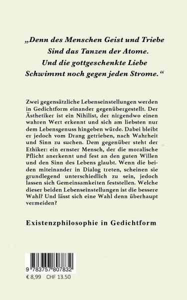 "Denn des Menschen Geist und Triebe Sind das Tanzen der Atome. Und die gottgeschenkte Liebe Schwimmt noch gegen jeden Strome." Zwei gegensätzliche Lebenseinstellungen werden in Gedichtform einander gegenübergestellt. Der Ästhetiker ist ein Nihilist, der nirgendwo einen wahren Wert erkennt und sich am liebsten nur dem Lebensgenuss hingeben würde. Dabei bleibt er verhängnisvoll vom Drang getrieben, nach Wahrheit und Sinn zu suchen. Dem gegenüber steht der Ethiker: ein ernster Mensch, der die moralische Pflicht anerkennt und fest an den guten Willen und den Sinn des Lebens glaubt. Wenn die beiden miteinander in Dialog treten, scheinen sie grundlegend unterschiedlich zu sein, dennoch lassen sich Gemeinsamkeiten feststellen. Wie soll der Mensch wählen? Und lässt sich die Wahl zwischen zwei extremen Gegensätzen überhaupt vermeiden, wenn der Sinn ungreifbar geworden ist?Existenzphilosophie in Gedichtform