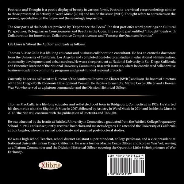Poetraits and Thought is a poetic display of beauty in various forms. Poetraits are visual verse renderings similar to those presented in Artistry in Word Music (2014) and Inside the Muse (2017). Thought refers to narratives on the present, speculation on the future and the seemingly impossible. The four parts of the book are prefaced by "Experience the Poem" The first part offer word paintings on Cultural Perspectives, Octogenarian Consciousness and Beauty in the Open. The second part entitled "Thought" deals with Collaboration for Innovation, Collaborative Competitiveness and "Fantasy: the Quantum Frontier." Life Lines is "About the Author" and reads as follows: Thomas A. Mac Calla is a life-long educator and business collaboration consultant. He has an earned a doctorate from the University of California, Los Angeles and completed post-doctoral studies in educational administration, community development and urban services. He was a vice president at National University in San Diego, California and Executive Director of the National University Community Research Institute, where he coordinated collaborative business-academic-community programs and grant-funded regional projects. Currently, he serves as Executive Director of the Southwest Innovation Cluster (SWIC) and is on the board of directors of the San Diego North Economic Development Council. He also is a former U.S. Marine Corps Officer and a Korean War Vet who served as a platoon commander and the Division Historical Officer.