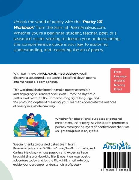 Unlock the world of poetry with the "Poetry 101 Workbook" from the team at PoemAnalysis.com. This book is designed to provide a complete understanding of poetry in a fun, visually pleasing, and easy-to-learn way. Whatever your motivation, this comprehensive guide is the key to exploring, understanding, and appreciating the art of poetry. What can you expect? With our innovative F.L.A.M.E. methodology, you'll discover a structured approach to breaking down poems into manageable components. This workbook makes poetry accessible and engaging for readers of all levels. From the rhythmic patterns of meter to the evocative imagery of language and the profound depths of meaning, you'll learn to appreciate the nuances of poetry in a whole new way. The "Poetry 101 Workbook" also includes Poetry 101 Worksheets (perfect for analyzing poetry with ease, using the book's support material and F.L.A.M.E. methodology, with a completed example for guidance) and a complete glossary of literary and poetic terms. Whatever terminology you encounter, you'll know exactly what it means. As part of PoemAnalysis.com and Poetry+ membership, we've sold thousands of digital versions of the "Poetry 101 Workbook." Now, we are thrilled to bring you the printed edition, complete with many extras for readers and learners to enjoy.