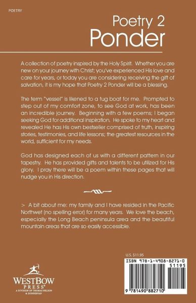A collection of poetry inspired by the Holy Spirit. Whether you are new on your journey with Christ; you've experienced His love and care for years, or today you are considering receiving the gift of salvation, it is my hope that Poetry 2 Ponder will be a blessing. The term "vessel" is likened to a tug boat for me. Prompted to step out of my comfort zone, to see God at work, has been an incredible journey. Beginning with a few poems; I began seeking God for additional inspiration. He spoke to my heart and revealed He has His own bestseller comprised of truth, inspiring stories, testimonies, and life lessons; the greatest resources in the world, sufficient for my needs. God has designed each of us with a different pattern in our tapestry. He has provided gifts and talents to be utilized for His glory. I pray there will be a poem within these pages that will nudge you in His direction.