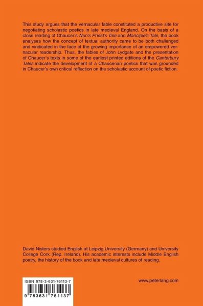 This study argues that the vernacular fable constituted a productive site for negotiating scholastic poetics in late medieval England. On the basis of a close reading of Chaucer's Nun's Priest's Tale and Manciple's Tale, the book analyses how the concept of textual authority came to be both challenged and vindicated in the face of the growing importance of an empowered vernacular readership. Thus, the fables of John Lydgate and the presentation of Chaucer's texts in some of the earliest printed editions of the Canterbury Tales indicate the development of a Chaucerian poetics that was grounded in Chaucer's own critical reflection on the scholastic account of poetic fiction.