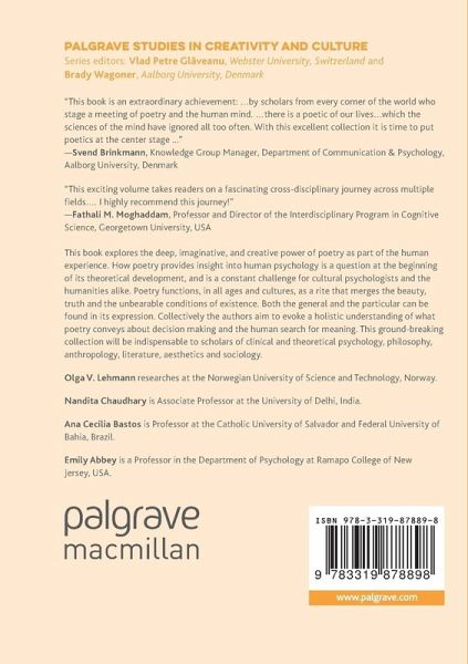 This book explores the deep, imaginative, and creative power of poetry as part of the human experience. How poetry provides insight into human psychology is a question at the beginning of its theoretical development, and is a constant challenge for cultural psychologists and the humanities alike. Poetry functions, in all ages and cultures, as a rite that merges the beauty, truth and the unbearable conditions of existence. Both the general and the particular can be found in its expression. Collectively the authors aim to evoke a holistic understanding of what poetry conveys about decision making and the human search for meaning. This ground-breaking collection will be indispensable to scholars of clinical and theoretical psychology, philosophy, anthropology, literature, aesthetics and sociology.