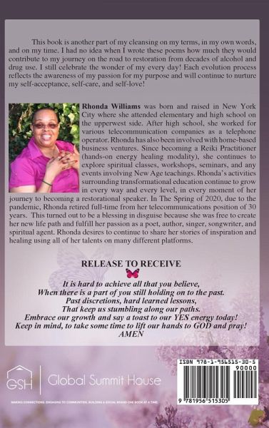 This book is another part of my cleansing on my terms, in my own words, and on my time. I had no idea when I wrote these poems how much they would contribute to my journey on the road to restoration from decades of alcohol and drug use. I still celebrate the wonder of my every day! Each evolution process reflects the awareness of my passion for my purpose and will continue to nurture my self-acceptance, self-care, and self-love!