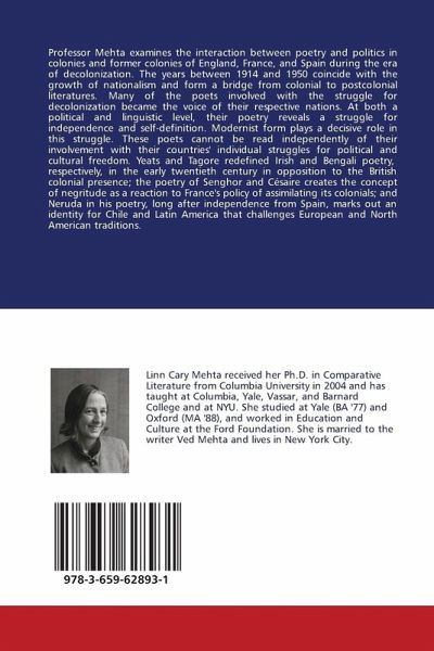 Professor Mehta examines the interaction between poetry and politics in colonies and former colonies of England, France, and Spain during the era of decolonization. The years between 1914 and 1950 coincide with the growth of nationalism and form a bridge from colonial to postcolonial literatures. Many of the poets involved with the struggle for decolonization became the voice of their respective nations. At both a political and linguistic level, their poetry reveals a struggle for independence and self-definition. Modernist form plays a decisive role in this struggle. These poets cannot be read independently of their involvement with their countries' individual struggles for political and cultural freedom. Yeats and Tagore redefined Irish and Bengali poetry, respectively, in the early twentieth century in opposition to the British colonial presence; the poetry of Senghor and Césaire creates the concept of negritude as a reaction to France's policy of assimilating its colonials; and Neruda in his poetry, long after independence from Spain, marks out an identity for Chile and Latin America that challenges European and North American traditions.