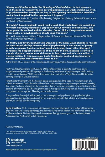 Poetry and Psychoanalysis: The Opening of the Field provides a guide to applying a poet's imagination and precision of language to the healing endeavours of psychoanalysis while making a lucid journey through 2,000 years of transformative poetry from Virgil, Dante and Blake to the contemporary poet Claudia Rankine.