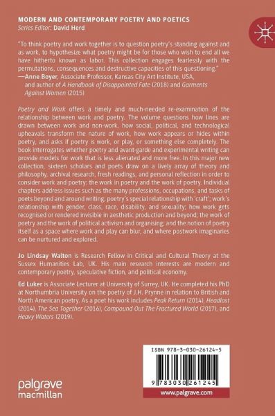 Poetry and Work offers a timely and much-needed re-examination of the relationship between work and poetry. The volume questions how lines are drawn between work and non-work, how social, political, and technological upheavals transform the nature of work, how work appears or hides within poetry, and asks if poetry is work, or play, or something else completely. The book interrogates whether poetry and avant-garde and experimental writing can provide models for work that is less alienated and more free. In this major new collection, sixteen scholars and poets draw on a lively array of theory and philosophy, archival research, fresh readings, and personal reflection in order to consider work and poetry: the work in poetry and the work of poetry. Individual chapters address issues such as the many professions, occupations, and tasks of poets beyond and around writing; poetry's special relationship with 'craft'; work's relationship with gender, class, race,disability, and sexuality; how work gets recognised or rendered invisible in aesthetic production and beyond; the work of poetry and the work of political activism and organising; and the notion of poetry itself as a space where work and play can blur, and where postwork imaginaries can be nurtured and explored.