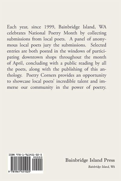 Each year, since 1999, Bainbridge Island, WA celebrates National Poetry Month by collecting submissions from local poets. A panel of anonymous local poets jury the submissions. Selected entries are both posted in the windows of participating downtown shops throughout the month of April, concluding with a public reading by all the poets, along with the publishing of this anthology. Poetry Corners provides an opportunity to showcase local poets' incredible talent and immerse our community in the power of poetry.