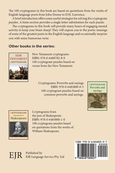 A collection of 100 cryptograms, based on quotations from the works of English language poets from John Donne to D.H. Lawrence. The selection includes poems from Blake, Coleridge, Wordsworth and Shelley, Walt Whitman and A.B. ‘Banjo’ Patterson. A brief introduction offers some useful strategies for solving the cryptogram puzzles. A hints section provides a single letter substitution for each puzzle. Answers are given at the end of the book. A size 14 font has been used for the puzzles. The cryptograms in this book will provide many hours of engaging mental activity to keep your brain sharp! They will expose you to the poetic musings of some of the greatest poets in the English language and occasionally surprise you with some humorous verse. This is one of a series of cryptogram puzzle books. Others in the series include ‘New Testament cryptograms’ (ISBN: 978-0-6480782-8-9), ‘Cryptograms: Proverbs and sayings’ (ISBN: 978-0-6485800-0-3) and ‘Cryptograms from the pen of Shakespeare’ (ISBN: 978-0-6485800-1-0). These cryptogram puzzles have been carefully selected to provide hours of enjoyment.