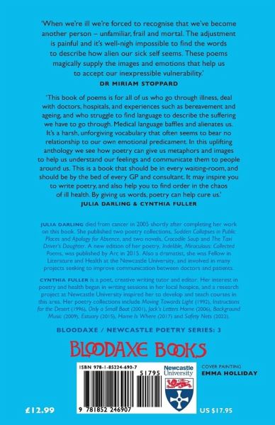 Julia Darling (1956-2005) was a poet, playright and fiction writer. She was a Royal Literary Fund Fellow at the School of English Literature, Language and Linguistics at Newcastle University. In 2003 she became the second winner of the the UK's biggest literary prize, the £60,000 Northern Rock Foundation Writer's Award. Fiona Ellis, the Foundation's Director, paid tribute after Julia's death: 'We were incredibly proud when Julia became the second holder of our Award. She was a wonderful writer and a quite extraordinary ambassador for writing.' In 2005 she lost a long battle with cancer. Her published work includes: a collection of short stories, Bloodlines (Panurge); two novels, Crocodile Soup and The Taxi Driver's Daughter (Penguin); and two collections of poetry, Sudden Collapses in Public Places and Apology for Absence (Arc). A new edition of her poetry, Indelible, Miraculous: Collected Poems, was published by Arc in 2015. With Cynthia Fuller she edited The Poetry Cure (Bloodaxe Books/Newcastle University, 2005), an anthology about illness and health. Her work for theatre and radio was collected in Eating the Elephant and Other Plays (New Writing North). Cynthia Fuller was born in Kent, but has lived in the North East since the 1970s. She has published five collections with Flambard: Moving Towards Light, Instructions for the Desert, Only a Small Boat, Background Music, and Jack's Letters Home, a Poetry Book Society Recommendation. Her most recent collection is Estuary (Red Squirrel Press, 2015). With Julia Darling she edited The Poetry Cure (Bloodaxe Books/Newcastle University, 2005), an anthology about illness and health. She was poetry editor for the magazine Writing Women for twelve years. She works freelance in Adult and Higher Education, teaching literature and creative writing, and runs writing workshops with different groups in the community. She is also involved in research into poetry and health at Newcastle University, and developing courses in this field.