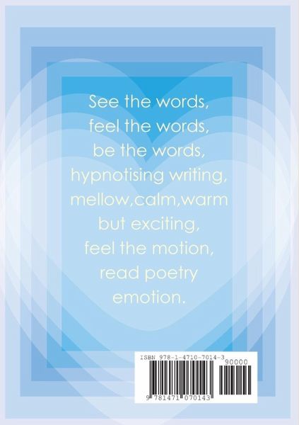 See the words, feel the words, be the words, hypnotising writing, mellow,calm,warm, but exciting, feel the energy, feel the motion, read poetry emotion.