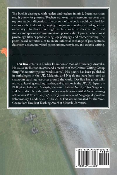 This book is developed with readers and teachers in mind. Poem lovers can read it purely for pleasure. Teachers can treat it as classroom resources that support student discussion. The content of the book would be suited for various levels of education, ranging from junior secondary to undergraduate university. The discipline might include social studies, intercultural studies, interpersonal communication, personal development, educational psychology, literacy practice, language pedagogy, and teacher training. The poem-based activities aim to create informal exchange of perspectives, classroom debate, individual presentations, essay ideas, and creative writing.