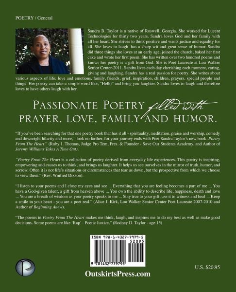 "If you've been searching for that one poetry book that has it all - spirituality, meditation, praise and worship, comedy and downright hilarity and more, - look no farther, for your journey ends with Poet Sandra Taylor's new book, "Poetry From The Heart." Ruby J. Thomas Judge Pro Tem, Pres. & Founder, Save Our Students Academy and Author of Jeremy Williams Takes A Time Out "Poetry From The Heart," is a collection of poetry derived from everyday life experiences. This poetry is inspiring, empowering and causes us to think and brings us laughter. It helps us see ourselves in the mirror of truth, humor, and sorrow. Often it is not life's situations or circumstances that tear us down, but the prospective from which we choose to view them." Rev. Winfred Dixson "I listen to your poems and I close my eyes and see...Everything that you are feeling becomes a part of me ...You have a God given talent, a gift from heaven above ...You own the ability to describe life, happiness, death and love ...You are a breath of wisdom as your poetry speaks to me ...Stay true to your gift, use it to witness and heal...Keep a smile in your heart - you are a poet real"Alice J. Kirk Lou Walker Senior Center Poet Laureate - 2007-2010 Author of Beginning Anew "The poems in "Poetry From The Heart" makes me think, laugh, inspires me to do my best and make good decisions. Some poems are like "Rap"- Poetic Justice." Rodney D. Taylor - Grandson - Age 15