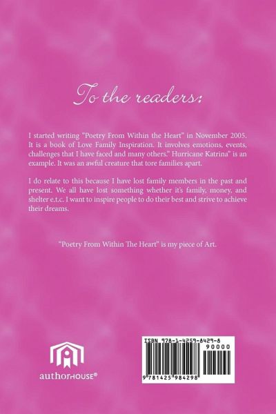 To the readers: I started writing "Poetry From Within the Heart" in November 2005. It is a book of Love Family Inspiration. It involves emotions, events, challenges that I have faced and many others." Hurricane Katrina" is an example. It was an awful creature that tore families apart. I do relate to this because I have lost family members in the past and present. We all have lost something whether it's family, money, shelter e.t.c. I want to inspire people to do their best and strive to achieve their dreams. "Poetry From Within The Heart" is my piece of Art.