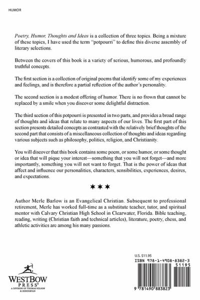 Poetry, Humor, Thoughts and Ideas is a collection of three topics. Being a mixture of these topics, I have used the term "potpourri" to define this diverse assembly of literary selections. Between the covers of this book is a variety of serious, humorous, and profoundly truthful concepts. The first section is a collection of original poems that identify some of my experiences and feelings, and is therefore a partial reflection of the author's personality. The second section is a generous offering of humor. Many of the selections have been edited and revised to satisfy my sensibilities and perspective. There is no frown that cannot be replaced by a smile when you discover some delightful distraction. The third section of this potpourri is presented in two parts, and provides a broad range of thoughts and ideas that relate to many aspects of our lives. The first part of this section presents detailed concepts as contrasted with the relatively brief thoughts of the second part that consists of a miscellaneous collection of thoughts and ideas regarding various subjects such as philosophy, politics, religion, and Christianity. You will discover that this book contains some poem, or some humor, or some thought or idea that will pique your interest-something that you will not forget-and more importantly, something you will not want to forget. That is the power of ideas that affect and influence our personalities, characters, sensibilities, experiences, desires, and expectations.