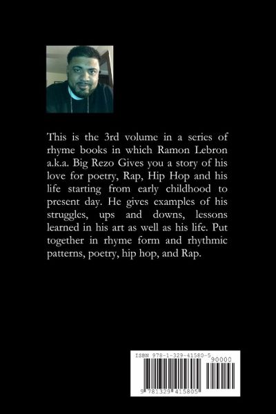 This is the 3rd volume in a series of rhyme books in which Ramon Lebron a.k.a. Big Rezo Gives you a story of his love for poetry, Rap, Hip Hop and his life starting from early childhood to present day. He gives examples of his struggles, ups and downs, lessons learned in his art as well as his life. Put together in rhyme form and rhythmic patterns, poetry, hip hop, and Rap.
