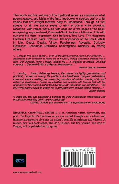 This fourth and final volume of The Equilibrist series is a compilation of all poems, essays, and fables of the first three books. A precious craft of artful verses that are straight forward, easy to understand. Through art that speaks to all, the author seeks to elicit emotions while provoking reflection. With verses that jump with ease out of the pages of the book, enrapturing anyone's heart, Cromwell-Smith tackles a full circle of life with subjects like Hope, Inspiration, Self-Reliance, True Love, The Happiness Formula, Optimism, Faith, Gratitude, The Importance of The Small Details in Life, Doubt, Duality, Virtue, Forgiveness, Adversity, Curiosity, Resilience, Coherence, Decisions, Convergence, Geniality, Joy among others.