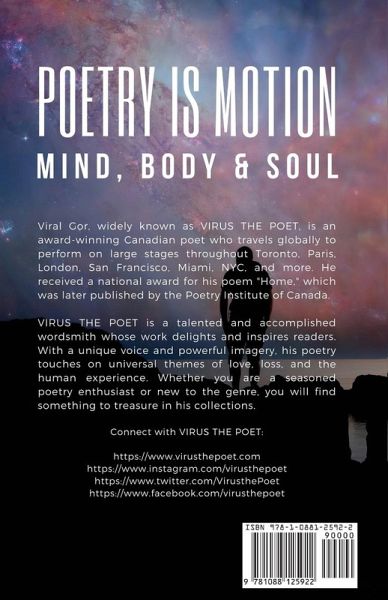Poetry Is Motion: Mind, Body & Soul is a captivating collection of poetry written by the award-winning Canadian poet, Viral Gor, widely known as Virus the Poet. In this remarkable anthology, he skillfully explores the depths of the human soul, transcending cultural boundaries to touch the hearts of readers from all walks of life. Through poignant verses and evocative imagery, Viral delves into the complexities of love, capturing its beauty, joys and heartaches. Each poem in this collection is a testament to the power of love, whether it be the euphoria of new beginnings, the bittersweet longing of separation, or the resilience of love in the face of adversity. Loss is another recurring theme in this collection, as Viral navigates the intricacies of grief and the profound impact it has on the human spirit. With raw emotion and vulnerability, he explores the various facets of loss, from the pain of letting go to the transformative power of healing. Drawing from personal experiences and observations, Viral offers a unique perspective on the human experience. Through his words, he illuminates the universal truths that connect us all, reminding readers of their shared humanity. From the complexities of identity to the fleeting moments of joy, Viral captures the essence of what it means to be alive. Poetry Is Motion: Mind, Body & Soul is a testament to the power of poetry to transcend cultural boundaries and touch the hearts of readers worldwide. With its lyrical prose and profound insights, this collection will leave a lasting impression, inviting readers to reflect on their own experiences and find solace in the beauty of language.th whose work delights and inspires readers. With a unique voice and powerful imagery, his poetry touches on universal themes of love, loss, and the human experience. Whether you are a seasoned poetry enthusiast or new to the genre, you will find something to treasure in his collections.