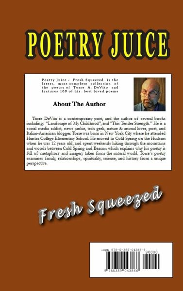 Poetry Juice is the most complete collection of the poetry of Torre A. DeVito with over 175 poems, including new and unpublished works.