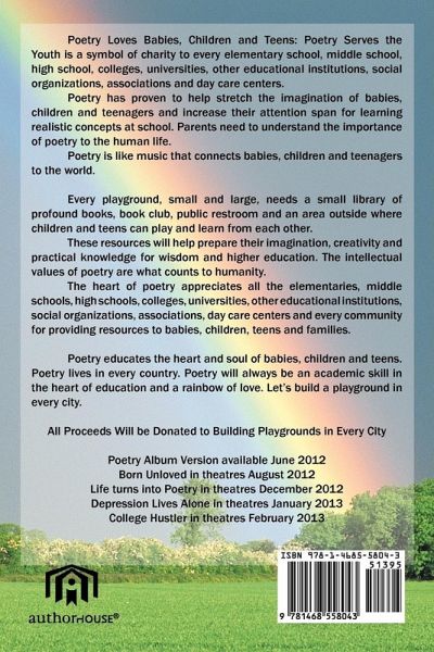 Poetry for babies, children and teens: Poetry Serves the Youth is a symbol of charity to every elementary school, middle school, high school, colleges, universities, other educational institutions, social organizations, associations and day care centers. Poetry has proven to help stretch the imagination of babies, children and teenagers and increase their attention span for learning realistic concepts at school. Parents need to understand the importance of poetry to the human life. Poetry is like music that connects babies, children and teenagers to the world. Every playground, small and large, needs a small library of profound books, book club, public restroom and an area outside where children and teens can play and learn from each other. These resources will help prepare their imagination, creativity and practical knowledge for wisdom and higher education. The intellectual values of poetry are what counts to humanity. The heart of poetry appreciates all the elementaries, middle schools, high schools, colleges, universities, other educational institutions, social organizations, associations, day care centers and every community for providing resources to babies, children, teens and families. Poetry educates the heart and soul of babies, children and teens. Poetry lives in every country. Poetry will always be an academic skill in the heart of education and a rainbow of love. Let's build a playground in every city. All Proceeds Will be Donated to Building Playgrounds in Every City Poetry Album Version available June 2012 Born Unloved in theatres August 2012 Life turns into Poetry in theatres December 2012 Depression Lives Alone in theatres January 2013 College Hustler in theatres February 2013