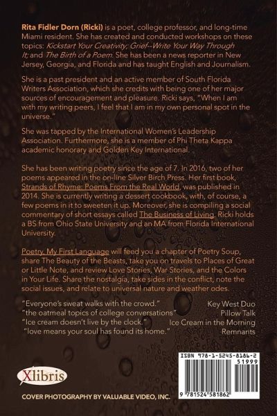 Rita Fidler Dorn (Ricki) Native New Yorker who grew up in Ohio; longtime South Florida resident; visible figure on the Miami academic and creative scenes. Past president of South Florida Writers Association. Creator/presenter of 3 writing lec-shops: How to Kick Start Your Own Creativity; Forgiveness; and Grief: Writing Your Way Through the Process. BS from Ohio State University; MA in English from FloridaInternational University; her masters thesis examines psychological influences of dysfunctional parents on adult children, specifically sibling groups, in three Woody Allen films. English professor at Miami Dade College and FIU. Creator of a myriad of academic and creative materials, word games, and of course, poetry. Scrabble addict, grammar guru, former newspaper reporter. Poet from age 7. Owner of English Specialist, her word-crafting/editing practice. Editing other peoples work, Dorn says, is giving it a semantic makeover. She harbors a deep personal love of and respect for the beauty and power of written words. Candle in my Dark, a poetic tribute to her mother, Beatrice Greenberg Fidler, appeared in the 2012 edition of Healthy Stories, published by the Miami Dade Health Department.The Givens, another poem, was the winner of a SFWA writing contest in 2012. Dorn credits South Florida Writers Association with being a significant networking and inspiration oasis for South Florida writers, at all levels and of all genres. Currently, she is working on two other books. One is Wisdom & Wit, a compendium of short essays, literary spinoffs, word play, and tributes to public, political, and literary figures. Why Monica Loves Chanukah is a childrens book, in rhyme, to give young audiences an appreciation of poetic sounds and of the rich tradition of this holiday.