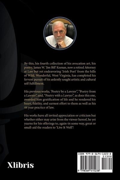 By this, his fourth collection of his avocation art, his poetry, James W. 'Jim Bill' Keenan, now a retired Attorney at Law but yet endeavoring 'Irish Poet' from the hills of Wild, Wonderful, West Virginia, has completed his fervent pursuit of his ardently sought artistic and cultural self fulfillment. His previous works, 'Poetry by a Lawyer", "Poetry from a Lawyer", and, "Poetry with a Lawyer", as does this one, awarded him gratification of life and he rendered his heart, fidelity, and earnest effort to them as well as his 44 year practice of law. His works have all invited appreciation or criticism but whether either may arise from the viewer hereof, he yet yearns for his offerings to, again-in some way, great or small-aid the readers to 'Live It Well'!
