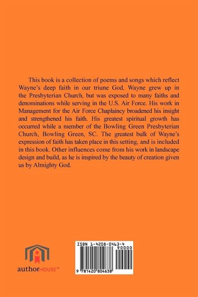 This book is a collection of poems and songs which reflect Wayne's deep faith in our triune God. Wayne grew up in the Presbyterian Church, but was exposed to many faiths and denominations while serving in the U.S. Air Force. His work in Management for the Air Force Chaplaincy broadened his insight and strengthened his faith. His greatest spiritual growth has occurred while a member of the Bowling Green Presbyterian Church, Bowling Green, SC. The greatest bulk of Wayne's expression of faith has taken place in this setting, and is included in this book. Other influences come from his work in landscape design and build, as he is inspired by the beauty of creation given us by Almighty God.