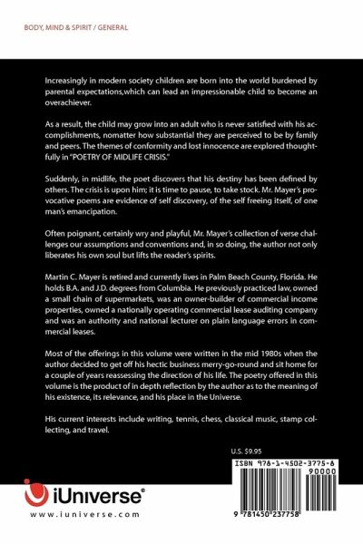 Increasingly in modern society children are born into the world burdened by parental expectations, which can lead an impressionable child to become an overachiever. As a result, the child may grow into an adult who is never satisfied with his accomplishments, no matter how substantial they are perceived to be by family and peers. The themes of conformity and lost innocence are explored thoughtfully in "POETRY OF MIDLIFE CRISIS." Suddenly, in midlife, the poet discovers that his destiny has been defined by others. The crisis is upon him; it is time to pause, to take stock. Mr. Mayer's provocative poems are evidence of self discovery, of the self freeing itself, of one man's emancipation. Often poignant, certainly wry and playful, Mr. Mayer's collection of verse challenges our assumptions and conventions and, in so doing, the author not only liberates his own soul but lifts the reader's spirits.