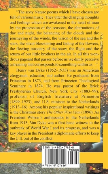 "The sixty Nature poems which I have chosen are full of various music. They utter the changing thoughts and feelings which are awakened in the heart of man by the procession of the seasons, the alternations of day and night, the balancing of the clouds and the journeying of the winds, the vision of the sea and the stars, the silent blossoming and fading of the flowers, the fleeting masonry of the snow, the flight and the return of our little brothers in the air. In all this wondrous pageant that passes before us we dimly perceive a meaning that corresponds to something within us..." Henry van Dyke (1852--1933) was an American clergyman, educator, and author. He graduated from Princeton in 1873, and from Princeton Theological Seminary in 1874. He was pastor of the Brick Presbyterian Church, New York City (1883--99), professor of English literature at Princeton (1899--1923), and U.S. minister to the Netherlands (1913--16). Among his popular inspirational writings is the Christmas story The Other Wise Man (1896). As President Wilson's ambassador to the Netherlands from 1913, Van Dyke was a first-hand witness to the outbreak of World War I and its progress, and was a key player in the President's diplomatic efforts to keep the U.S. out of the conflict.