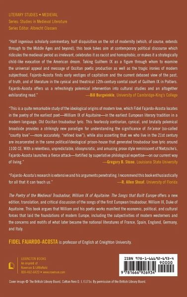 List of Figures Acknowledgments Preface and Disclaimer Introduction. William IX of Aquitaine, the Premodern and Postmodern Conditions William IX, First of the Moderns The Dialectic of Unreason: Romans, Christians, and Germanic Barbarians The New Subjects of Love Traveling to the Past Neither Past, Nor Other Women, Wealth, and Power Courtly Culture The Divinity of Love: Dante as a Troubadour Caveat Evangelista Chapter 1. The Life of William IX of Aquitaine Carolingian Period Capetians, Church, and Empire Aquitaine William IX of Aquitaine Crusade of 1101-1102 Robert d'Arbrissel Anjou and Other Affairs Two-Faced William Chapter 2. The Songs of William IX Manuscripts Manuscript C Manuscript D Manuscript E Manuscript I Manuscript K Manuscript N Manuscript R Manuscript V Manuscript a1 Song 1: "Companho, farai ieu un vers covinen" (My friends, I will make a proper song) Standard Bibliographic Text Identification Topic/Argument Date of Composition Primary Sources Genre Form and