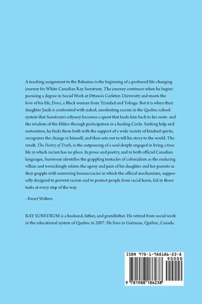 A teaching assignment to the Bahamas is the beginning of a profound life-changing journey for White Canadian Ray Sunstrum. The journey continues when he begins pursuing a degree in Social Work at Ottawa's Carleton University and meets the love of his life, Dora, a Black woman from Trinidad and Tobago. But it is when their daughter Janik is confronted with naked, unrelenting racism in the Quebec school system that Sunstrum's odyssey becomes a quest that leads him back to his roots and the wisdom of the Elders through participation in a healing Circle. Seeking help and restoration, he finds them both with the support of a wide variety of kindred spirits, recognizes the change in himself, and then sets out to tell his story to the world. The result, The Poetry of Truth, is the outpouring of a soul deeply engaged in living a true life in which racism has no place. In prose and poetry, and in both official Canadian languages, Sunstrum identifies the grappling tentacles of colonialism as the enduring villain and wrenchingly relates the agony and pain of his daughter and her parents as they grapple with unmoving bureaucracies in which the official mechanisms, supposedly designed to prevent racism and to protect people from racial harm, fail in those tasks at every step of the way. - Ewart Walters