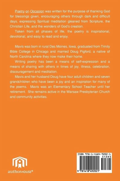 Poetry on Occasion was written for the purpose of thanking God for blessings given, encouraging others through dark and difficult days, expressing Spiritual meditation gleaned from Scripture, the Christian Life, and the wonders of God's creation. Taken from all phases of life, the poetry is inspirational, devotional, and easy to read and enjoy.