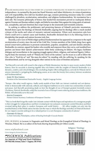 Polish messianism tells the story of a nation struggling to survive and regain its independence. As narrated by the poets Jan Pawe_ Woronicz and Adam Mickiewicz, its vision of patriotism and civil responsibility, first told two hundred years ago, contains promising resources today for a world facing challenged by pluralism, secularization, nationalism and religious fundamentalism. Yet this messianism has a dark side. The romantic philosophy of history that funded this messianism proved an inadequate defense against Prussian and Russian military might, and failed to inoculate Poles against the rising spirit of nationalism, xenophobia and anti-Semitism that swept Europe in the nineteenth and twentieth centuries. In seeking to address the problematic and promising feature of Poland's particular messianism, Burnell draws up on the theology of Dietrich Bonhoeffer, arguing that his theology offers a much-needed critique of the myths and values of romantic national messianism. Where such messianism asks how Christ could serve a nation's cause and freedom, Bonhoeffer declared that by it is by following Christ in discipleship that people and nations become truly free. Recently, a new wave of Polish religio-political fundamentalism has appeared, as a response to the rapid secularization of society since the end of the Cold War. Certain members of the Polish clergy have again joined conservative politicians to promote nationalistic, populist, xenophobic, and anti-Semitic attitudes. Bonhoeffer, in contrast, argued for leaders who ennoble and empower those they serve, and modeled how patriots can honor their nation's achievements while freely confessing its failures. His legacy facilitates dialogue and reconciliation in the ongoing struggle against ethnic, religious and national bigotry. Following his lead, the messianic myth of ""Poland, the Christ of the nations,"" can be recast as a call to follow the One who is ""God-for-us"" and ""the-man-for-others"" by standing with the suffering, by speaking for the disenfranchised, and serving alongside other nations in the cause of freedom and justice.